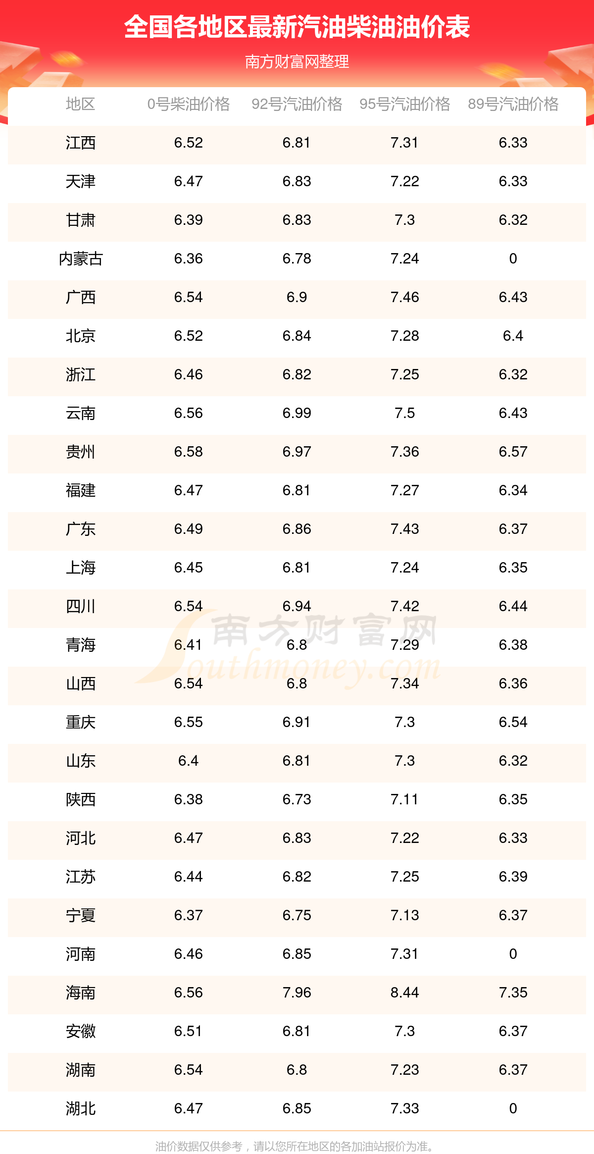 全国各地区最新油价表