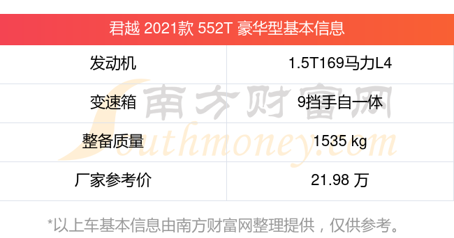 君越 2021款 552T 豪华型动力上搭载的是一台1.5T169马力L4涡轮增压发动机,匹配9挡手自一体自动档变速箱,燃料形式为汽油,常规整备质量1535kg,厂家参考价21.98万元。