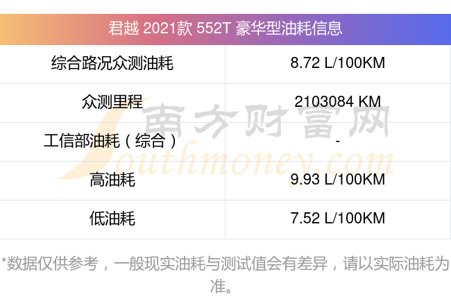 根据车主实测数据,该车型低油耗为7.52L/100km,高油耗为9.93L/100km,综合路况众测油耗为8.72L/100km,工信部综合油耗为-L/100km。