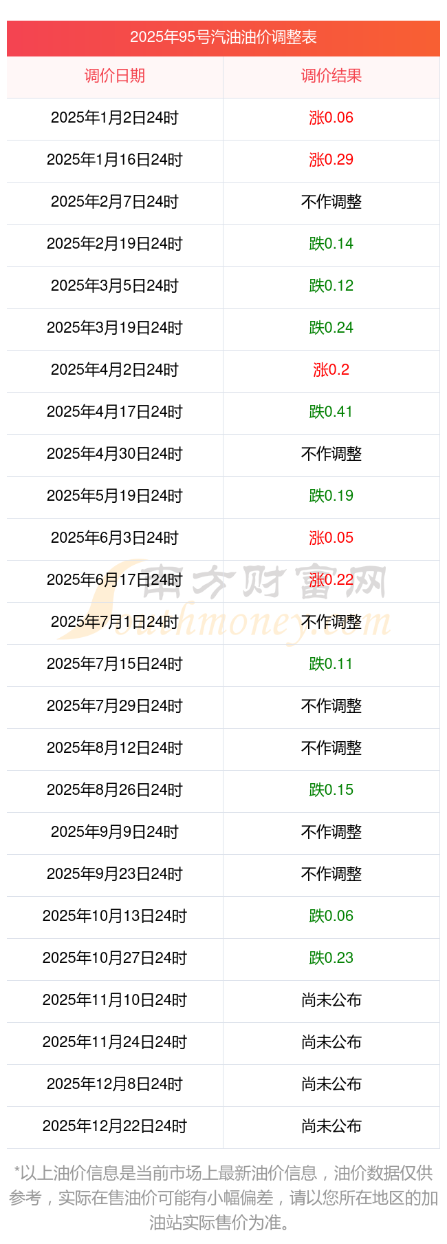 油价调整最新消息:全国95号汽油11月4日最新平均价格为7元/升,调整时间为10月28日。其中,全国95号汽油最低为陕西,价格为7.11元/升;95号汽油最高为海南,价格为8.44元/升。,下一轮汽油价格调整时间11月10日24时,距离现在还有6.96天。