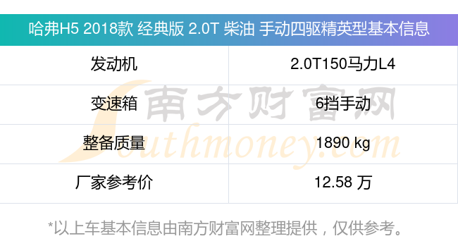 哈弗H5 2018款 经典版 2.0T 柴油 手动四驱精英型动力方面,搭载的是一台2.0T150马力L4涡轮增压发动机,匹配6挡手动挡变速箱,燃料形式为柴油,常规整备质量1890kg,厂家参考价12.58万元。