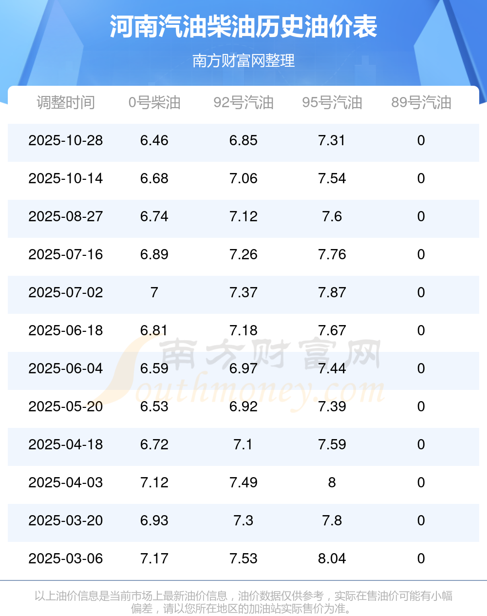 11月5日,河南95号汽油的价格是7.31元每升,本次的调整时间为10月28日,对比上次的调整下跌了0.23元,下跌3.05%,下次调整时间为11月10日24时,还有5.96天。