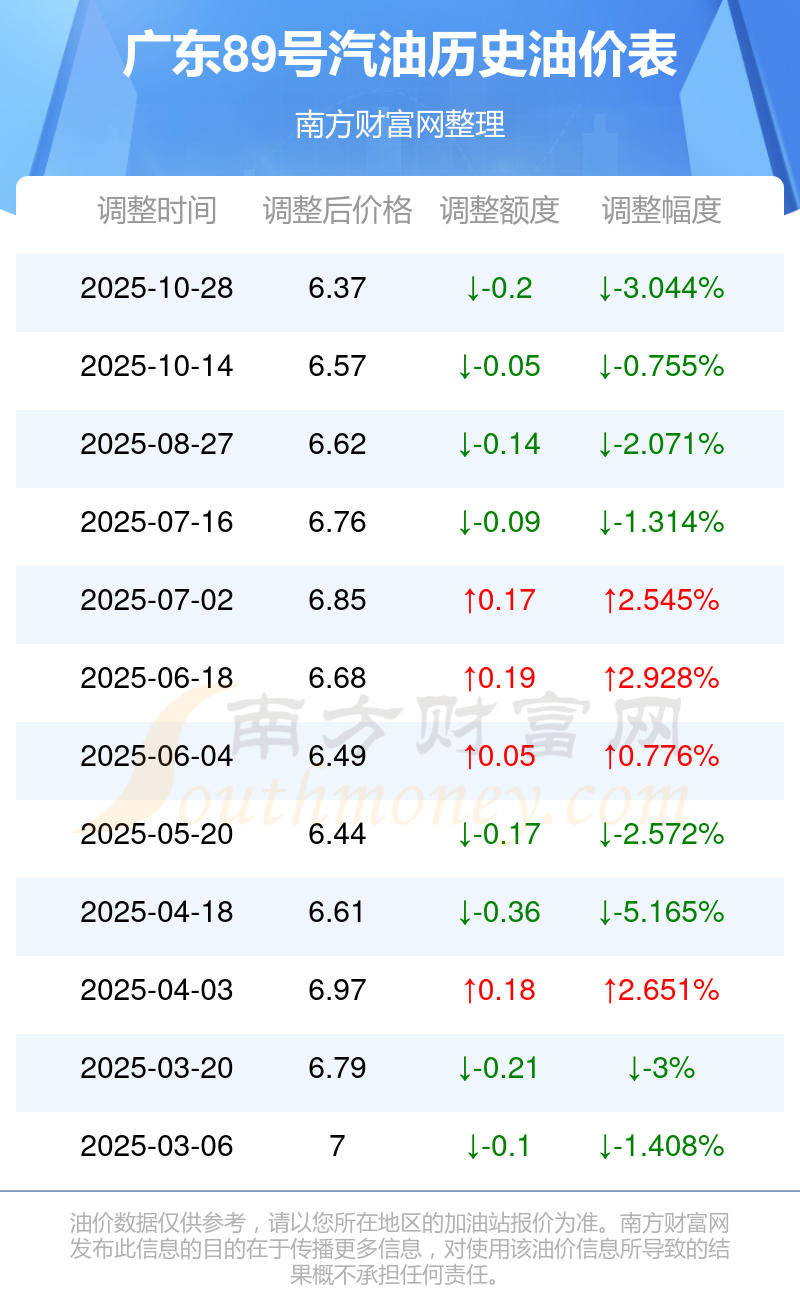 11月5日,广东89号汽油的价格是6.37元每升,本次的调整时间为10月28日,对比上次的调整降了0.2元,降3.044%,下次调整时间为11月10日24时,还有5.96天。