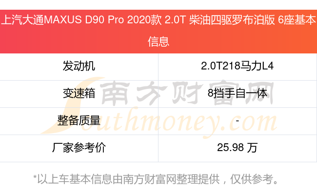 上汽大通MAXUS D90 Pro 2020款 2.0T 柴油四驱罗布泊版 6座动力上配备的是一台2.0T218马力L4双涡轮增压发动机,匹配的是8挡手自一体自动档变速箱,燃料形式为柴油,厂家参考价25.98万元。