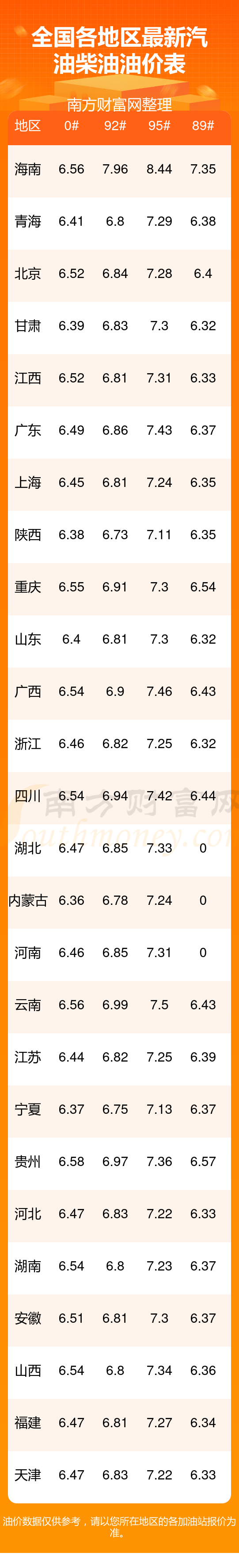 油价数据仅供参考,请以您所在地区的加油站报价为准。南方财富网发布此信息的目的在于传播更多信息,对使用该油价信息所导致的结果概不承担任何责任。
