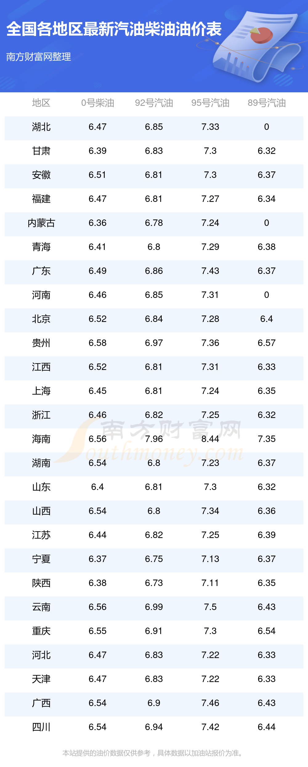 油价调整最新消息:这一轮油价调整的时间是10月28日,调整后全国油价的具体价格为:92号汽油平均价格为7元每升,其中,最低的是陕西,6.73元每升,最高的是海南,7.96元每升。95号汽油平均价格为7元每升,其中,最低的是陕西,7.11元每升,最高的是海南,8.44元每升。0号柴油平均价格为:6元每升,其中,最低的是内蒙古,6.36元每升,最高的是贵州,6.58元每升。89号汽油平均价格为6元每升,其中,最低的是浙江,6.32元每升,最高的是海南,7.35元每升。下一轮汽油价格调整时间11月10日24时,距离现在还有5.96天。