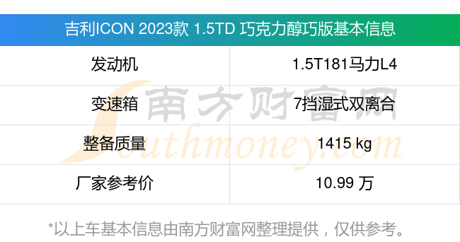 在动力方面,吉利ICON 2023款 1.5TD 巧克力醇巧版搭载的是一台1.5T181马力L4涡轮增压发动机,匹配7挡湿式双离合自动档变速箱,燃料形式为汽油,常规整备质量1415kg,厂家参考价10.99万元。