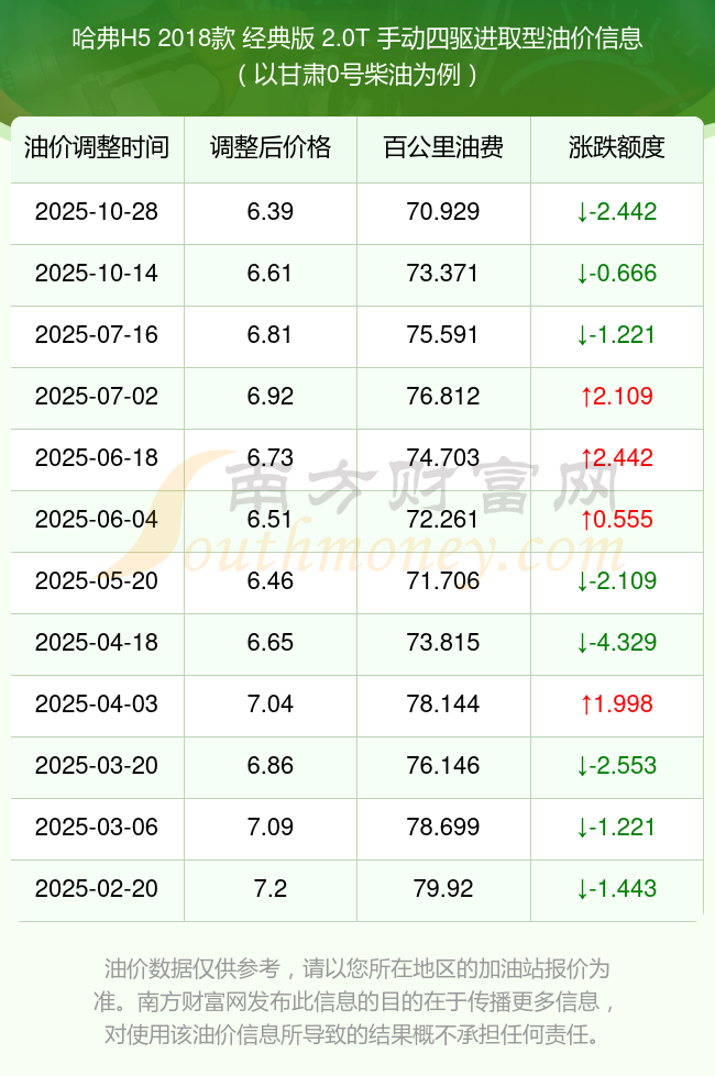 按10月28日0号柴油最新调整价格6.39元每升来计算(以甘肃为例),该车型百公里平均油费为70.929元,按上一轮10月14日调整价格6.61元每升来计算,百公里平均油费为73.371元,对比上一轮少花2.442元,下一轮油价调整时间为11月10日24时。