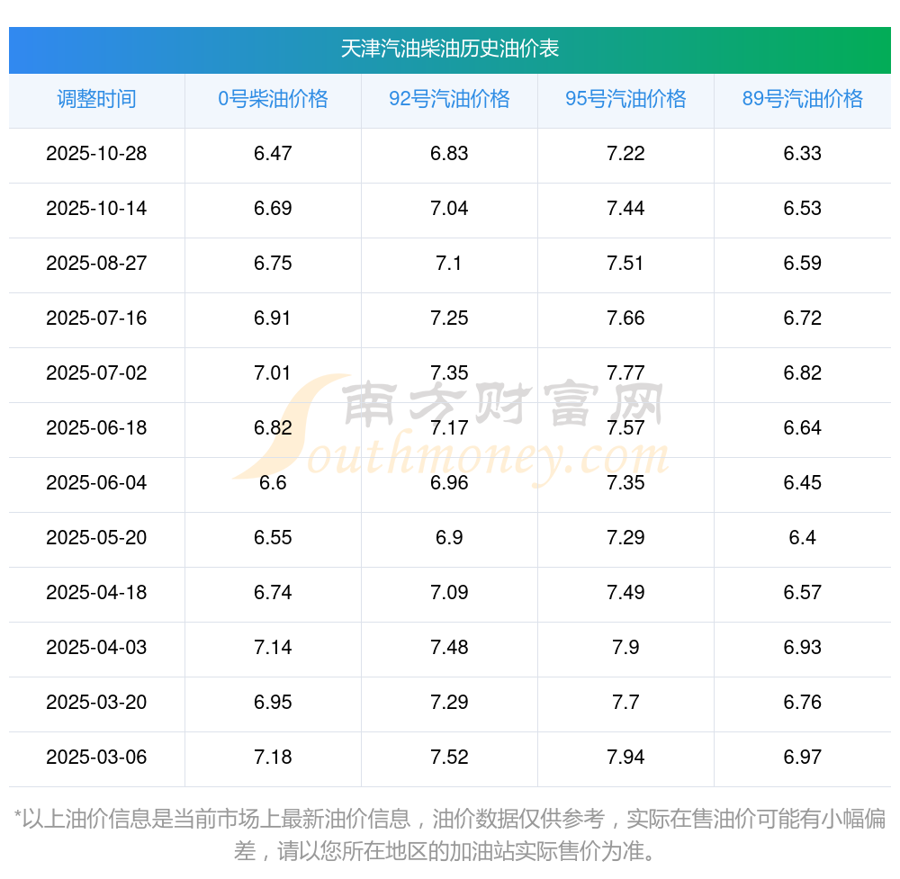 11月5日,天津95号汽油的价格是7.22元每升,本次的调整时间为10月28日,对比上次的调整下调了0.22元,下调2.957%,11月10日24时为下一轮油价调整时间,还有5.96天。