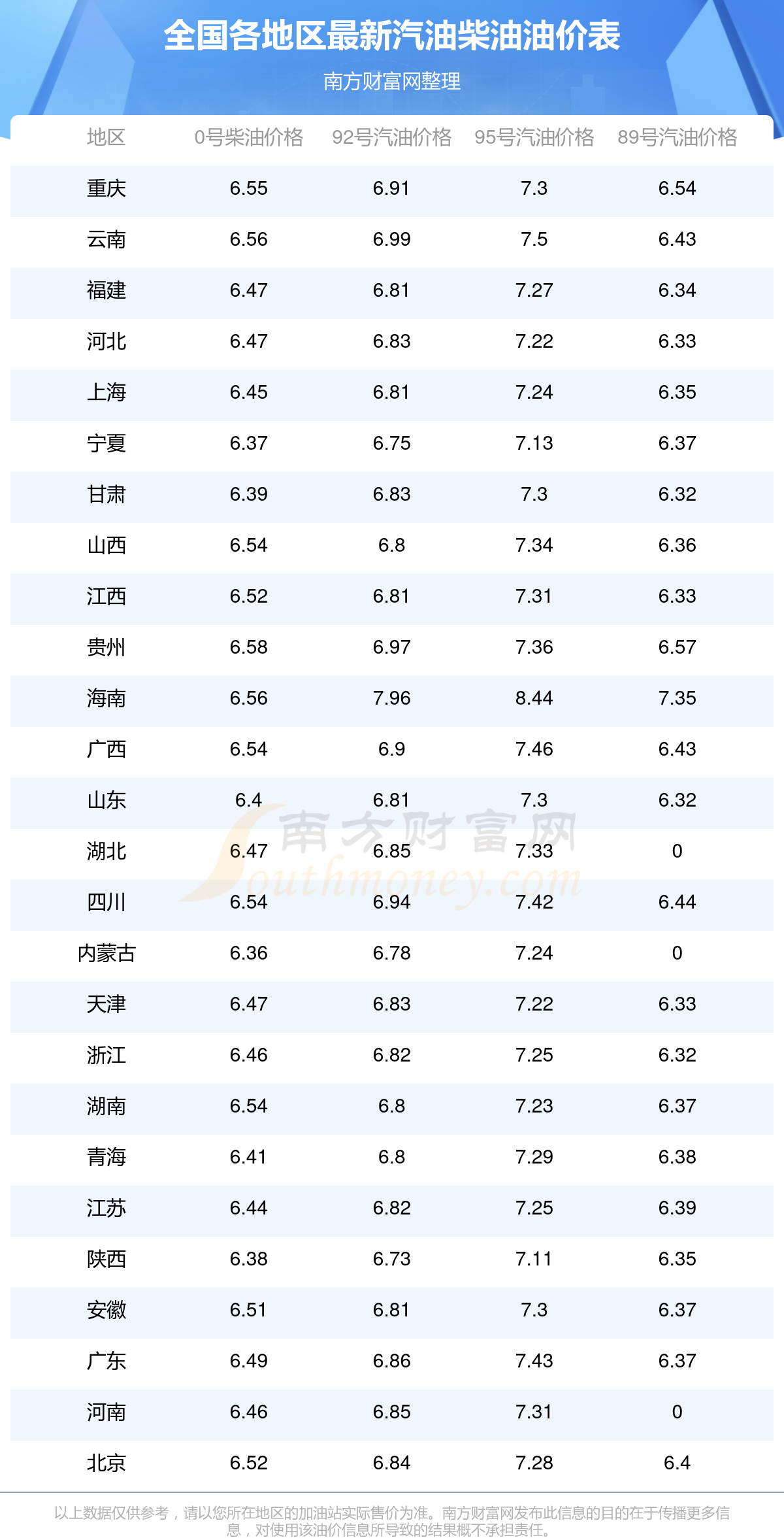 油价最新调整时间为10月28日,全国92号汽油最新平均价格为:7元每升,其中,最低为陕西,价格为6.73元/升,最高为海南,价格为7.96元/升。全国95号汽油最新平均价格为:7元每升,其中,最低为陕西,价格为7.11元/升,最高为海南,价格为8.44元/升。全国0号柴油最新平均价格为:6元每升,其中,最低为内蒙古,价格为6.36元/升,最高为贵州,价格为6.58元/升。全国89号汽油最新平均价格为:6元每升,其中,最低为浙江,价格为6.32元/升,最高为海南,价格为7.35元/升。,下一轮油价调整时间11月10日24时,距离现在还有5.96天。