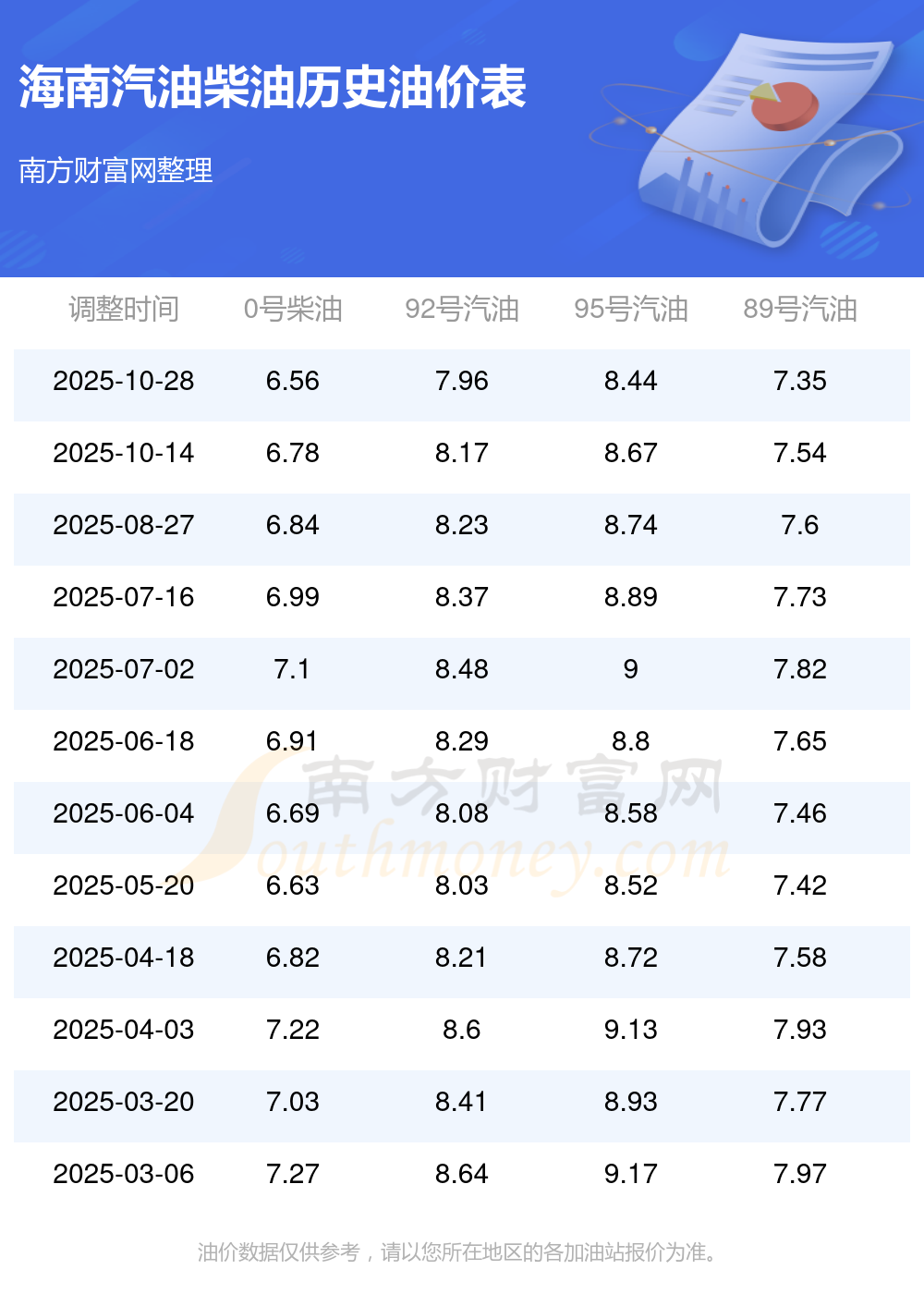 11月5日海南汽油、柴油每升的价格为10月28日调整后的价格,92号汽油为7.96元,减了0.21元,减幅达2.57%;95号汽油为8.44元,减了0.23元,减幅达2.65%;89号汽油为7.35元,减了0.19元,减幅达2.52%;0号柴油为6.56元,减了0.22元,减幅达3.25%。