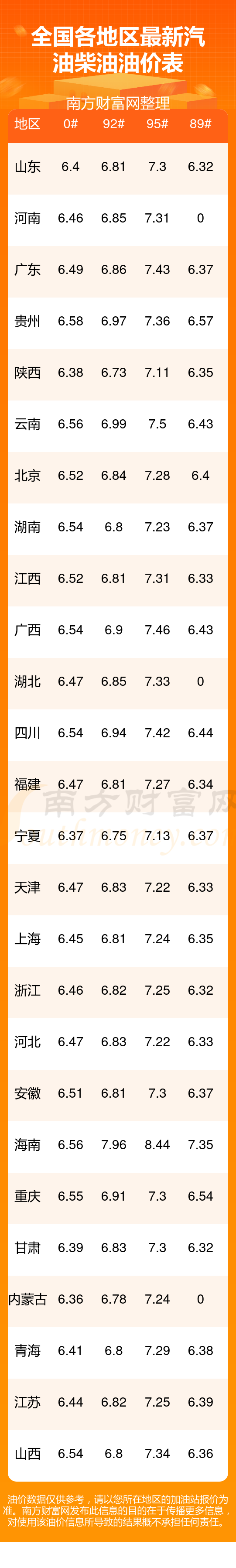本次油价调整的时间为10月28日 ,调整后全国油价具体为: