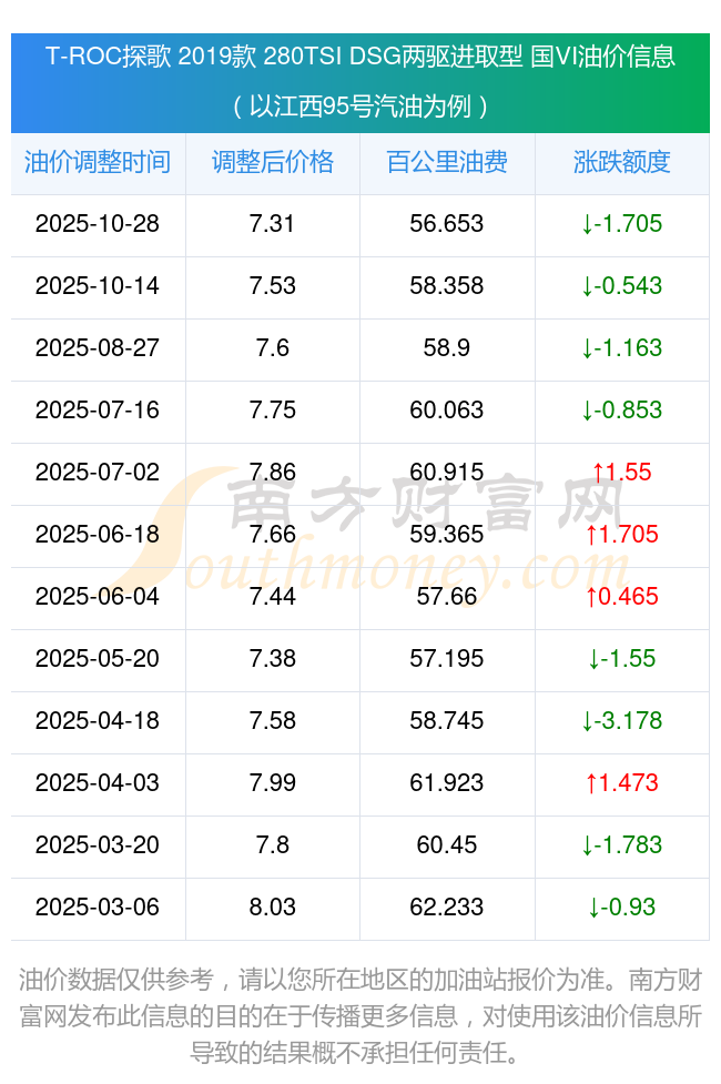 根据10月28日95号汽油最新调整价格7.31元/升来计算(以江西为例),该车型每百公里的平均油费是56.653元,上一轮10月14日调整价格7.53元每升来计算,每百公里的平均油费是58.358元,对比上一轮少花1.705元,下一轮的油价调整时间是11月10日24时。
