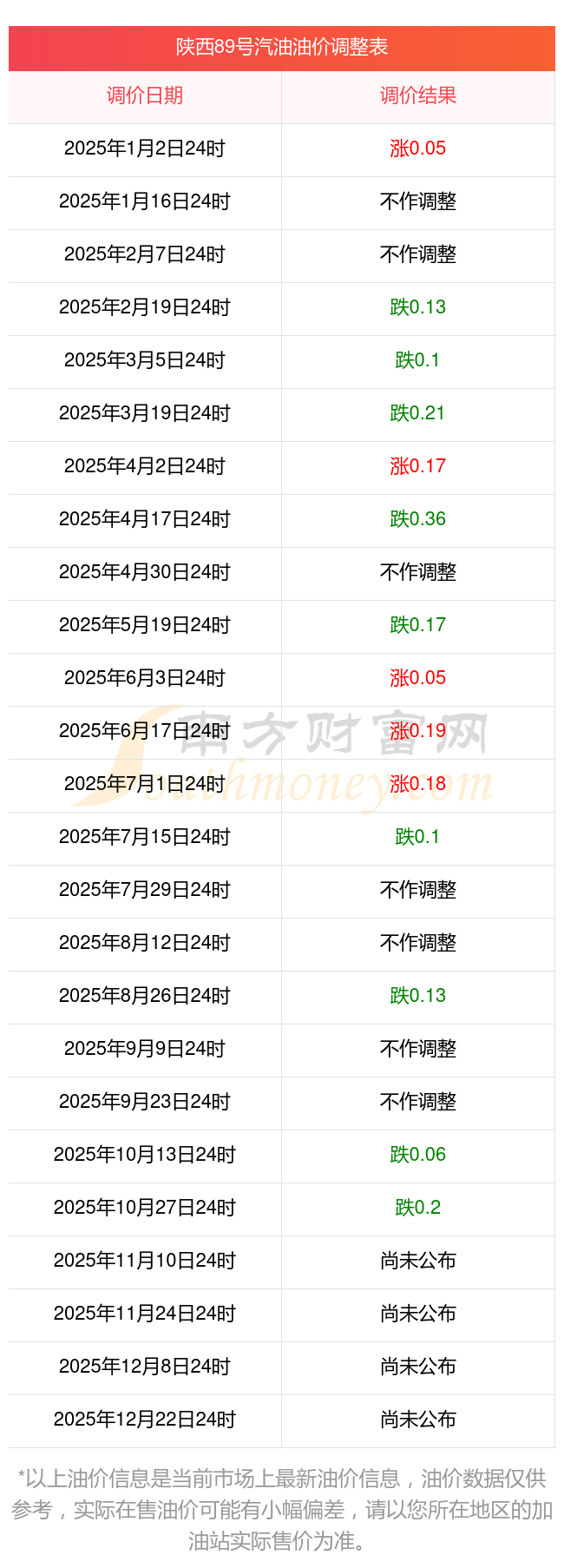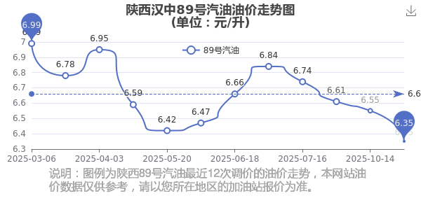 11月5日陕西汉中89号汽油的价格是10月28日调整后的价格,具体为6.35元/升,对比上次调整时间10月14日的油价6.55元每升,下调了0.2元,下调幅达3.053%。