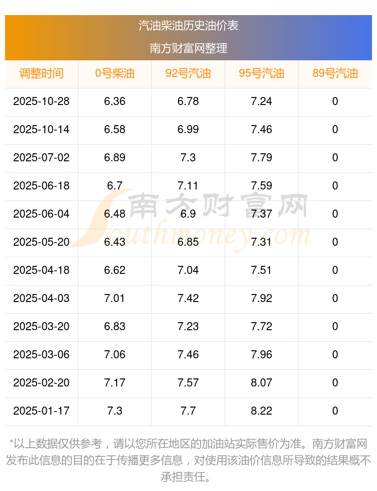 2025年汽油柴油油价调整一览表