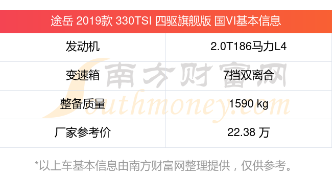 途岳 2019款 330TSI 四驱旗舰版 国VI动力上配备的是一台2.0T186马力L4涡轮增压发动机,匹配的是7挡双离合自动档变速箱,燃料形式为汽油,常规整备质量1590kg,厂家参考价22.38万元。