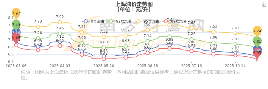 上海汽油、柴油11月5日的价格是多少钱一升?具体如下:92号汽油为6.81元,下调了0.21元;95号汽油为7.24元,下调了0.23元;89号汽油为6.35元,下调了0.2元;0号柴油为6.45元,下调了0.22元,本轮油价的调整时间为10月28日。