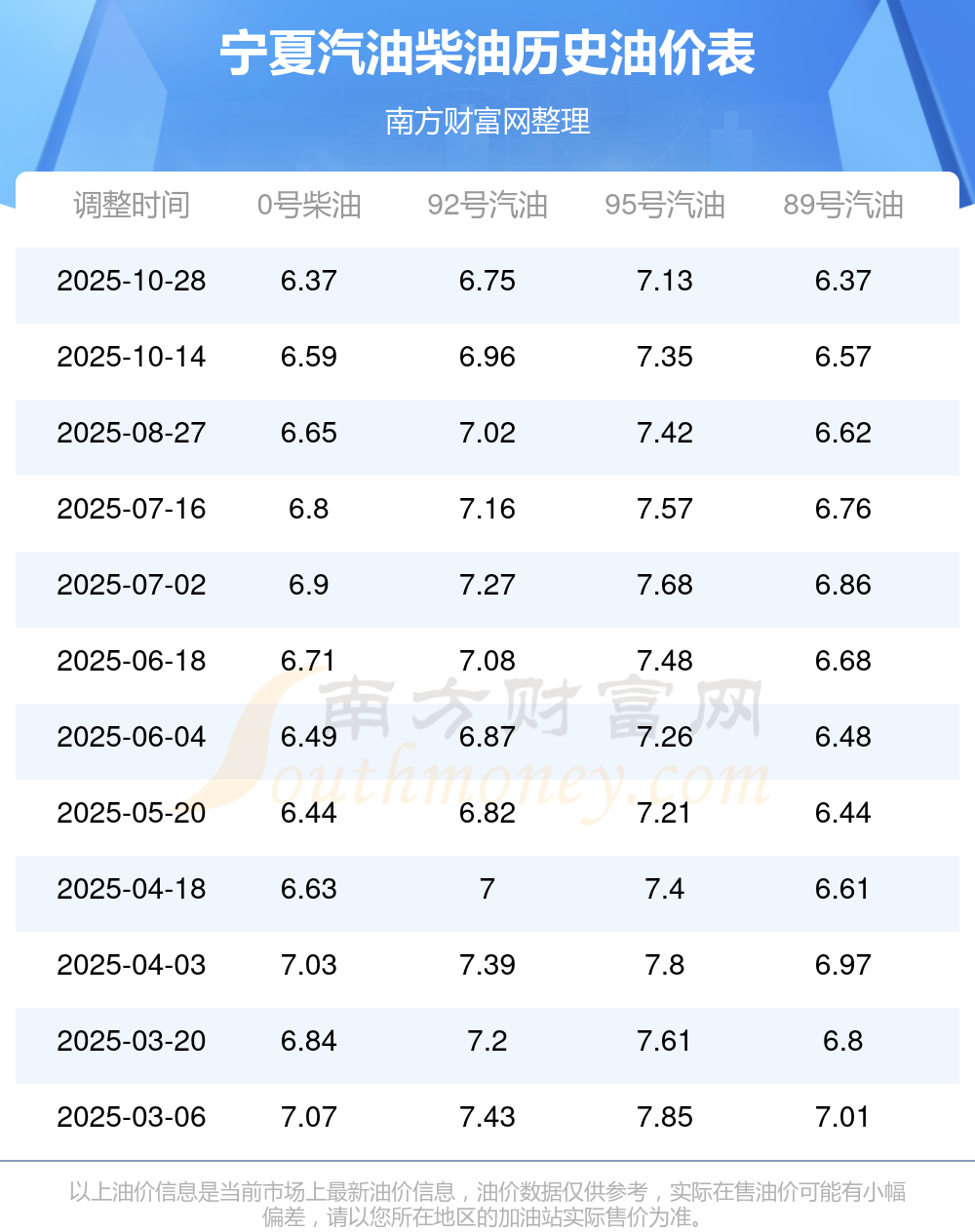 11月5日,宁夏92号汽油的价格是6.75元每升,本次的调整时间为10月28日,对比上次的调整跌了0.21元,跌3.017%,下次调整时间为11月10日24时,还有5.96天。