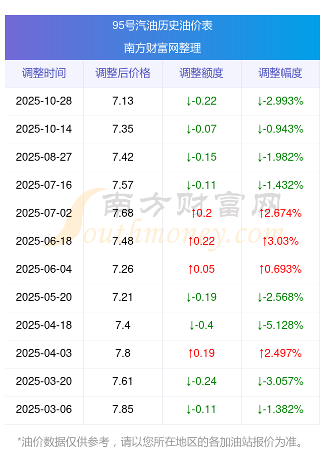 11月8日汽油柴油每升的价格为10月28日调整后的价格,具体如下:92号汽油6.75元;95号汽油7.13元;89号汽油6.37元;0号柴油6.37元。下一轮油价调整时间11月10日24时,距离现在还有2.6天。