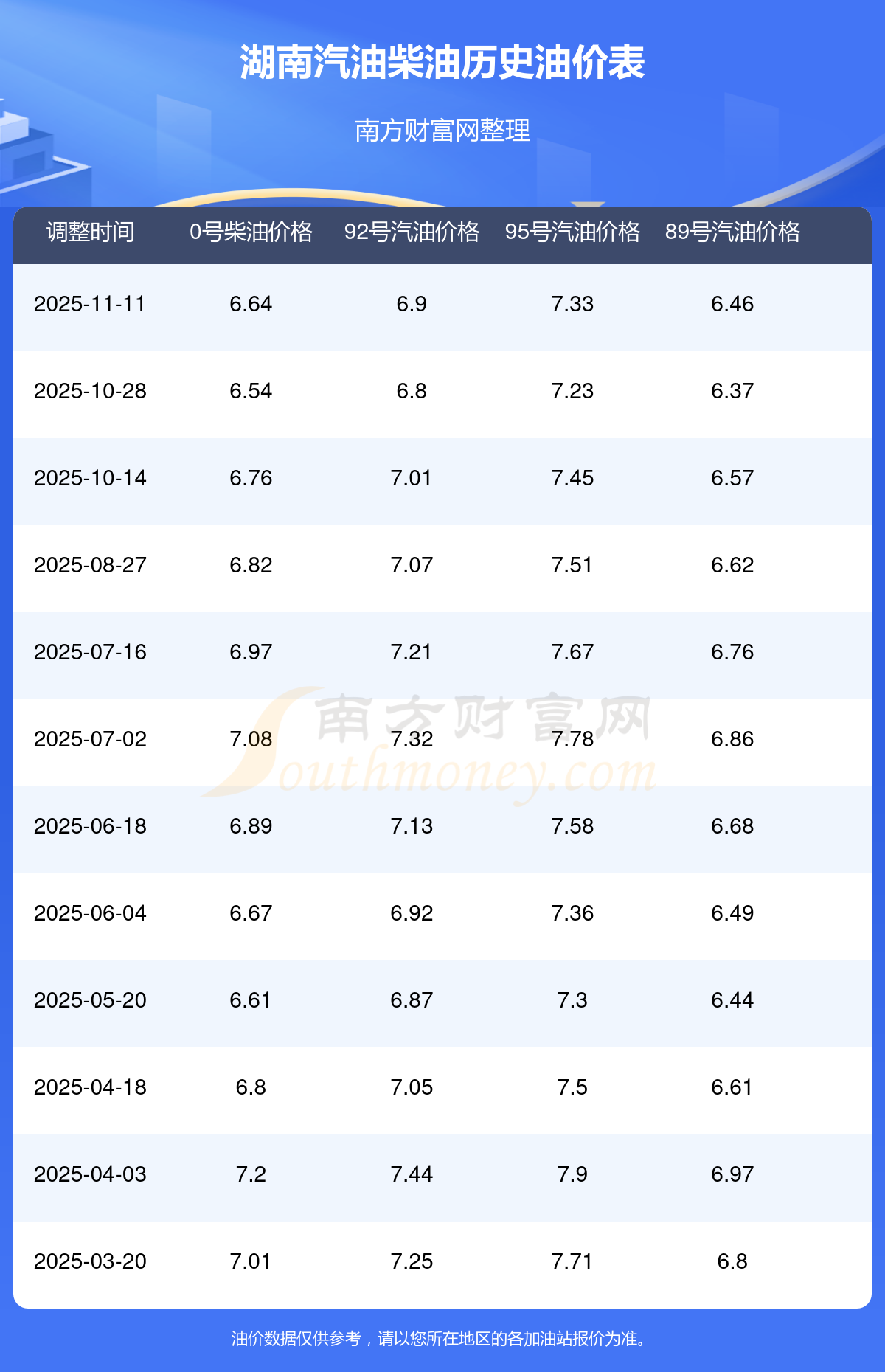 11月14日,湖南0号柴油的价格是6.64元每升,本次的调整时间为11月11日,对比上次的调整升了0.1元,升1.583%,11月24日24时为下一轮油价调整时间,还有10.86天。
