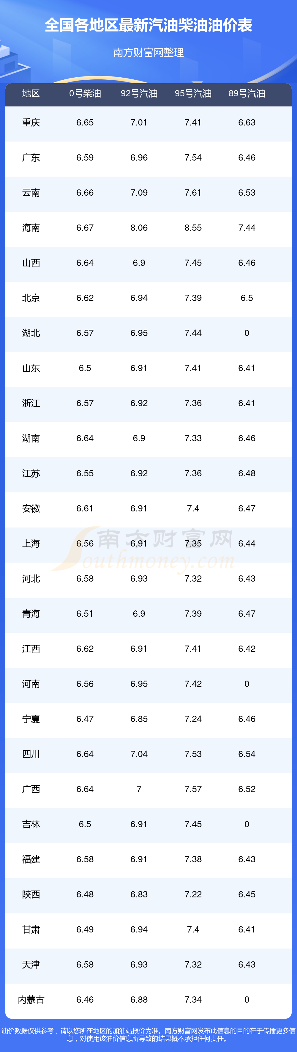 全国0号柴油平均价格为:7元每升,其中,最低为内蒙古,价格6.46元/升,最高为海南,价格6.67元/升。