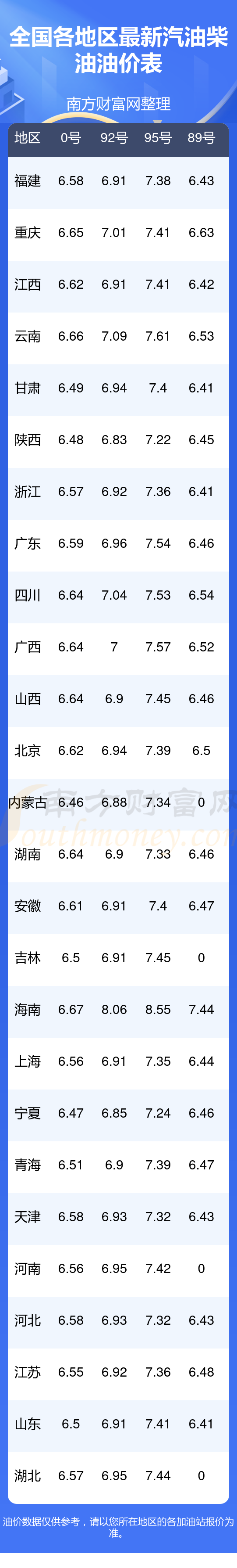 以上数据仅供参考,请以您所在地区的加油站实际售价为准。南方财富网发布此信息的目的在于传播更多信息,对使用该油价信息所导致的结果概不承担责任。