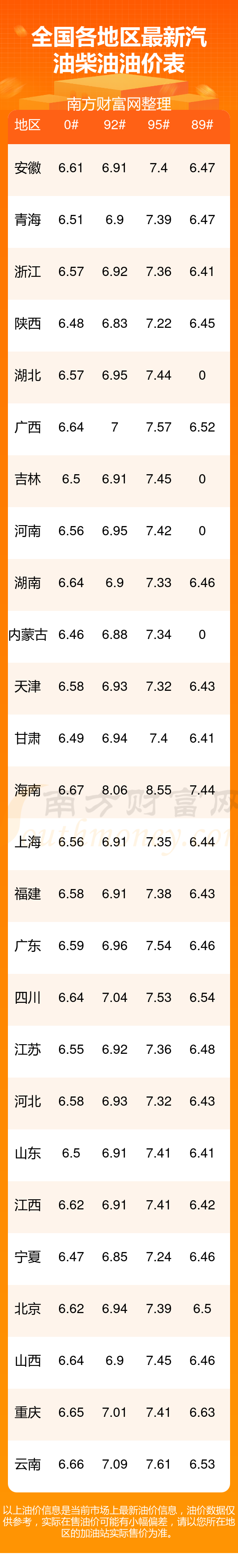 以上油价信息是当前市场上最新油价信息,油价数据仅供参考,实际在售油价可能有小幅偏差,请以您所在地区的加油站实际售价为准。