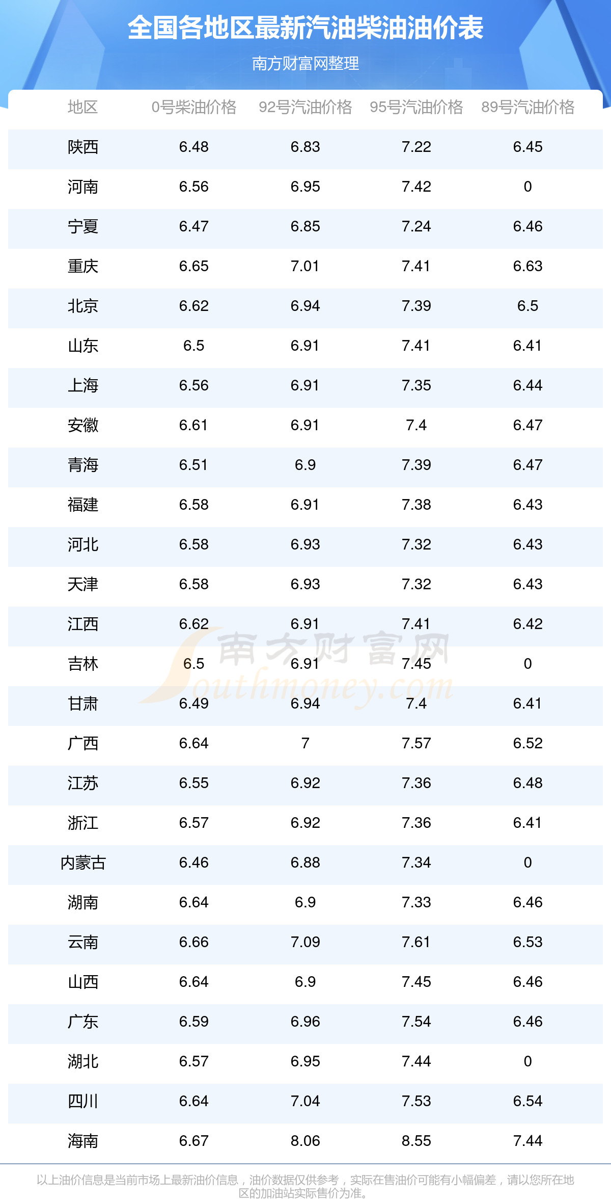 油价数据仅供参考,请以您所在地区的加油站报价为准。南方财富网发布此信息的目的在于传播更多信息,对使用该油价信息所导致的结果概不承担任何责任。