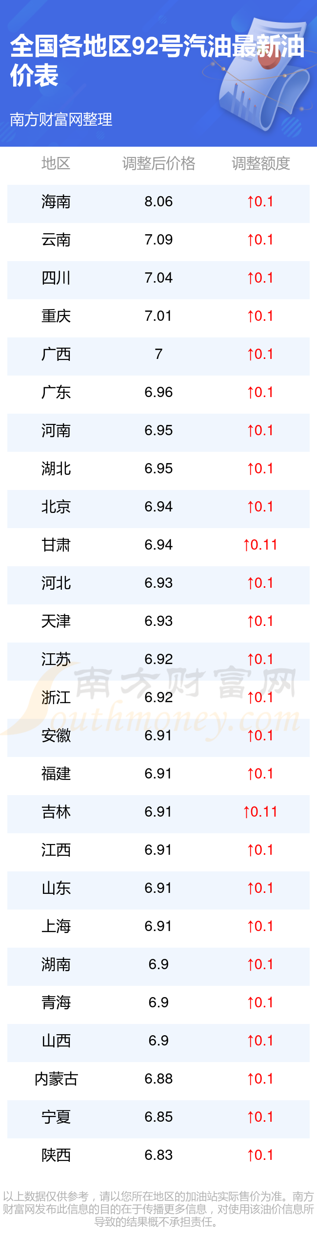 全国各地区92号汽油油价一览表