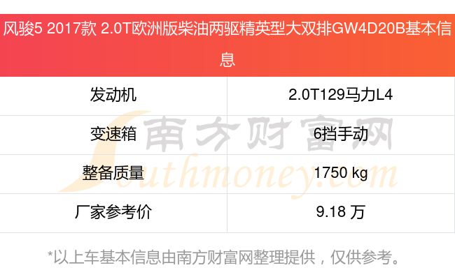在动力上,风骏5 2017款 2.0T欧洲版柴油两驱精英型大双排GW4D20B配备的是一台2.0T129马力L4涡轮增压发动机,匹配的是6挡手动挡变速箱,燃料形式为柴油,常规整备质量1750kg,厂家参考价9.18万元。