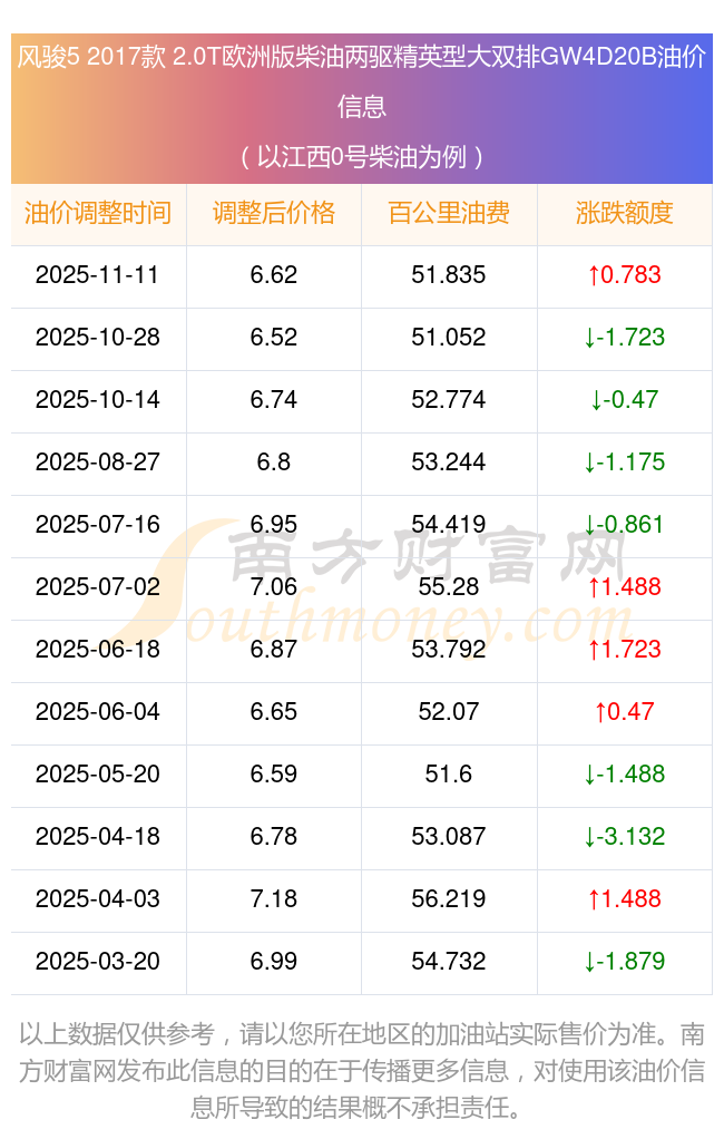 根据11月11日0号柴油最新调整价格6.62元/升来计算(以江西为例),该车型每百公里的平均油费是51.835元,上一轮10月28日调整价格6.52元每升来计算,每百公里的平均油费是51.052元,对比上一轮多花0.783元,下一轮的油价调整时间是11月24日24时。