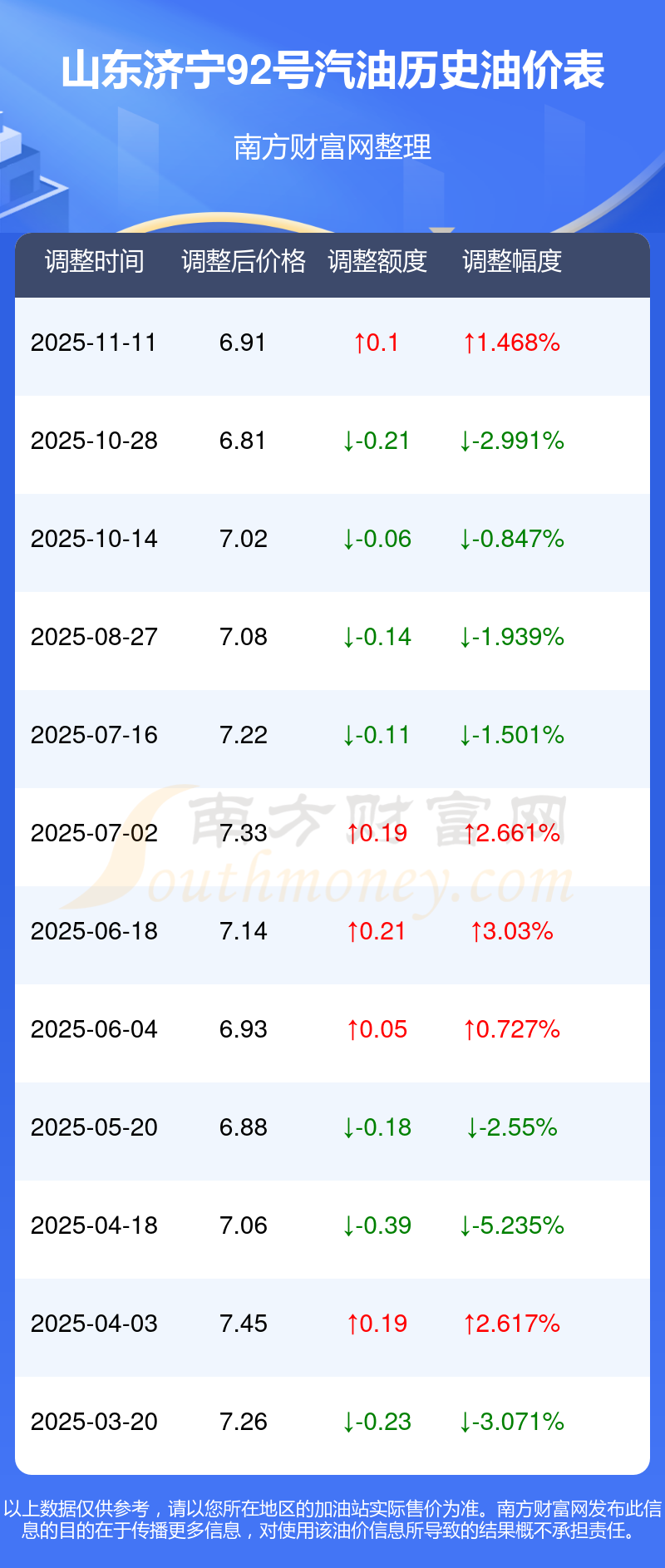 11月14日,山东济宁92号汽油今日价格(调整时间为11月11日):6.91元每升,对比上次调整(10月28日)的油价6.81元每升,共增了0.1元,增幅达1.468%。下一轮油价调整时间11月24日24时,距离现在还有10.7天。