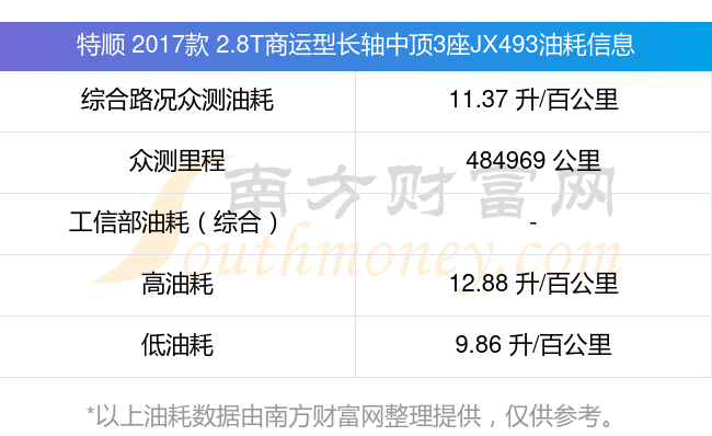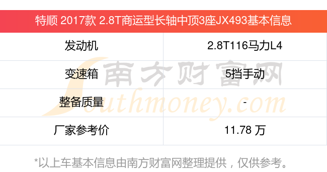 特顺 2017款 2.8T商运型长轴中顶3座JX493动力上配备的是一台2.8T116马力L4涡轮增压发动机,匹配的是5挡手动挡变速箱,燃料形式为柴油,厂家参考价11.78万元。
