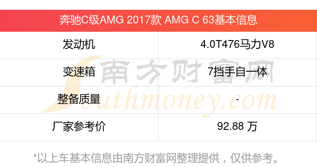 奔驰C级AMG 2017款 AMG C 63搭载了一台4.0T476马力V8双涡轮增压发动机,采用7挡手自一体自动档变速箱,厂家参考价92.88万元。