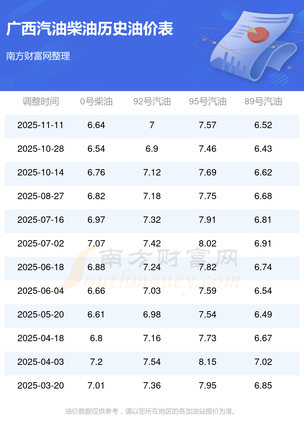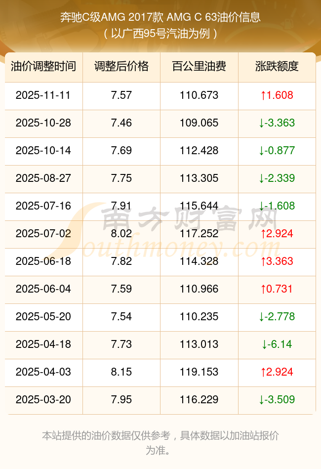 按11月11日95号汽油最新调整价格7.57元每升来计算(以广西为例),该车型百公里平均油费为110.673元,按上一轮10月28日调整价格7.46元每升来计算,百公里平均油费为109.065元,对比上一轮多花1.608元,下一轮油价调整时间为11月24日24时。