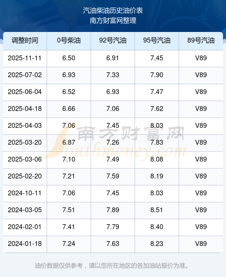 11月14日长春92号汽油的价格为6.91元/升,为11月11日油价调整后的价格,相对上次调整上升了0.11元,上升1.618%。下一轮油价调整时间11月24日24时,距离现在还有10.7天。