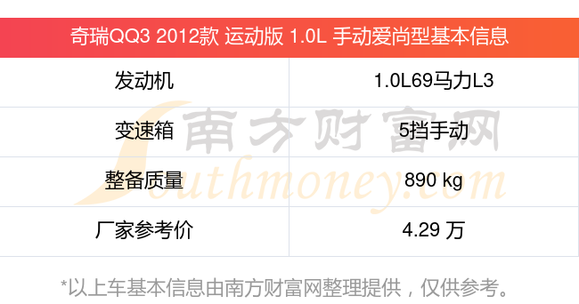 奇瑞QQ3 2012款 运动版 1.0L 手动爱尚型动力上配备的是一台1.0L69马力L3自然吸气发动机,匹配的是5挡手动挡变速箱,燃料形式为汽油,常规整备质量890kg,厂家参考价4.29万元。
