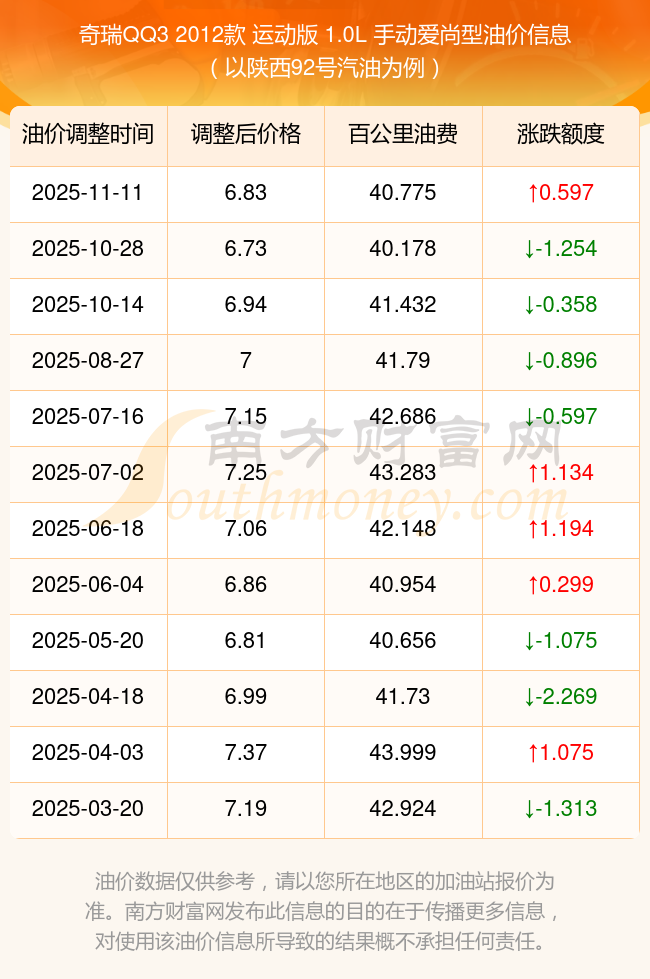 按照11月11日92号汽油最新调整价格6.83元/升来计算(以陕西为例),该车型百公里平均油费为40.775元,按照上一轮10月28日调整价格6.73元/升来计算,百公里平均油费为40.178元,对比上一轮多花0.597元,下一轮油价调整时间为11月24日24时。