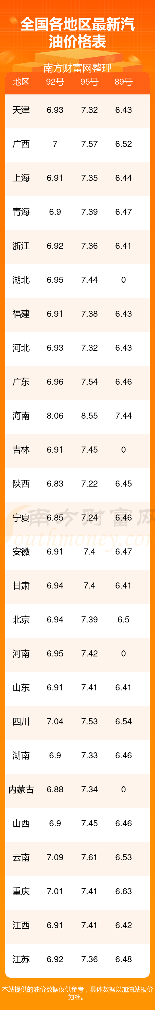 2025年11月14日全国油价调整及最新汽油价格表