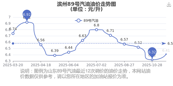 11月14日滨州89号汽油的价格为6.41元/升,这是11月11日调整后的价格,相对上次调整时间10月28日的油价6.32元每升,上调了0.09元,上调幅达1.424%。
