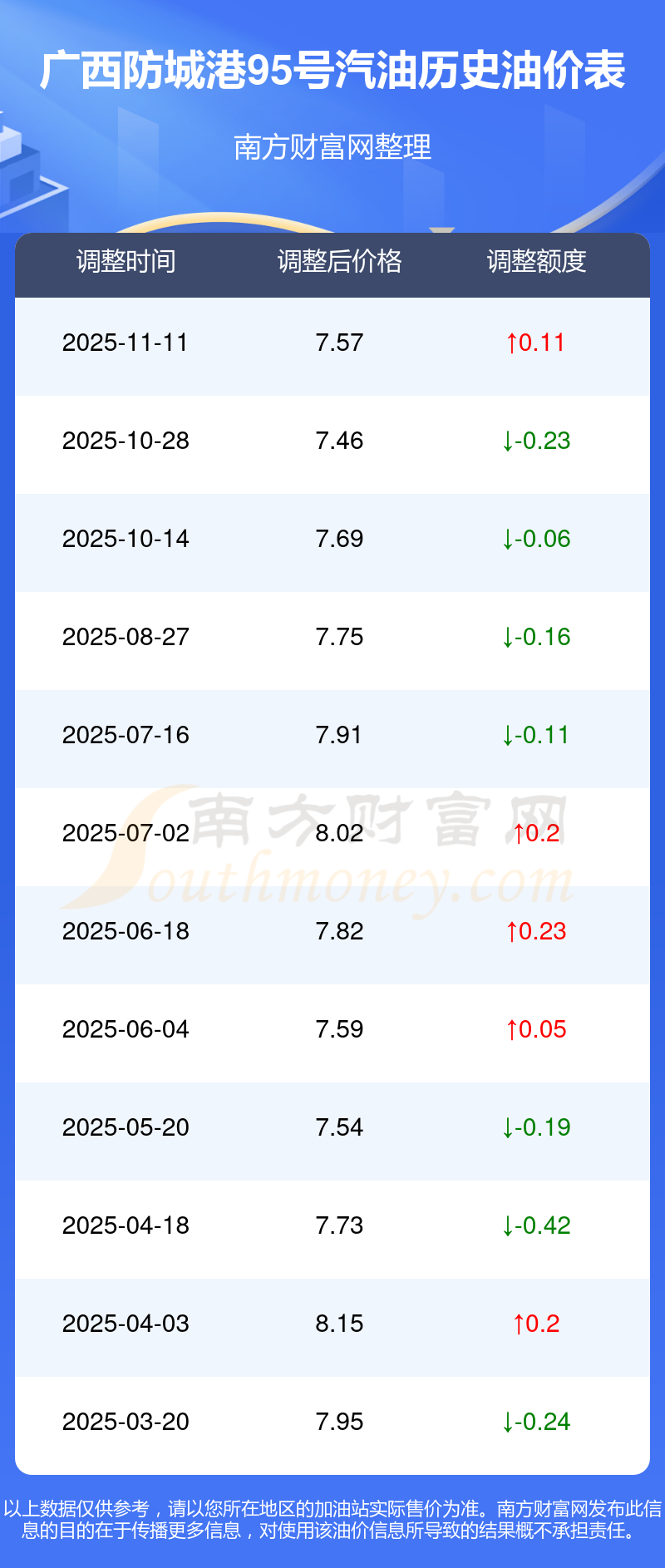 11月14日广西防城港95号汽油的价格为7.57元/升,本轮油价的调整时间为11月11日,相对上一轮油价调整时间10月28日的价格7.46元/升,上调了0.11元,上调幅达1.475%。下一轮油价调整时间11月24日24时,距离现在还有10.67天。
