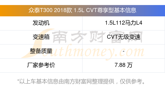 在动力方面,众泰T300 2018款 1.5L CVT尊享型搭载的是一台1.5L112马力L4自然吸气发动机,匹配CVT无级变速自动档变速箱,燃料形式为汽油,厂家参考价7.88万元。