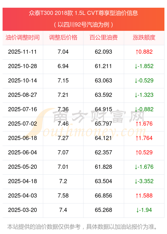 按照11月11日92号汽油最新调整价格7.04元/升来计算(以四川为例),该车型百公里平均油费为62.093元,按照上一轮10月28日调整价格6.94元/升来计算,百公里平均油费为61.211元,对比上一轮多花0.882元,下一轮油价调整时间为11月24日24时。