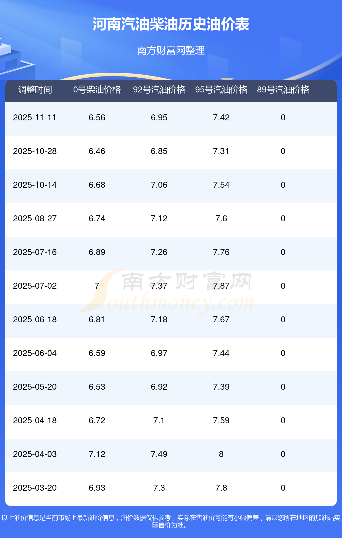 11月14日,河南92号汽油的价格是6.95元每升,本次的调整时间为11月11日,对比上次的调整涨了0.1元,涨1.46%,11月24日24时为下一轮油价调整时间,还有10.65天。