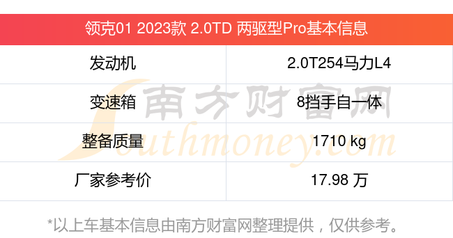 领克01 2023款 2.0TD 两驱型Pro动力方面,搭载的是一台2.0T254马力L4涡轮增压发动机,匹配8挡手自一体自动档变速箱,燃料形式为汽油,常规整备质量1710kg,厂家参考价17.98万元。