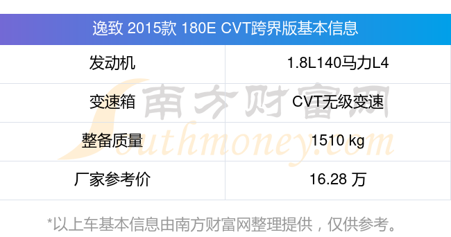 逸致 2015款 180E CVT跨界版动力方面,搭载的是一台1.8L140马力L4自然吸气发动机,匹配CVT无级变速自动档变速箱,燃料形式为汽油,常规整备质量1510kg,厂家参考价16.28万元。