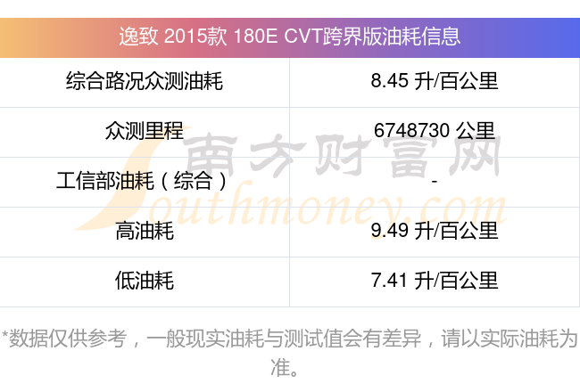 根据车主实测数据,该车型低油耗为7.41L/100km,高油耗为9.49L/100km,综合路况众测油耗为8.45L/100km,工信部综合油耗为-L/100km。