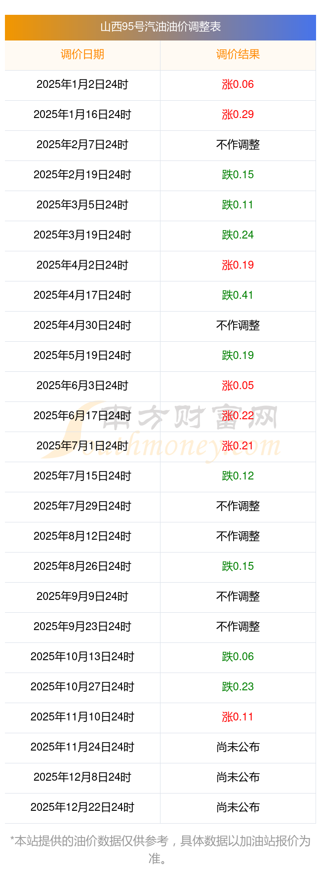 11月14日太原汽油、柴油每升价格详情为:92号汽油为6.9元,升了0.1元;95号汽油为7.45元,升了0.11元;89号汽油为6.46元,升了0.1元;0号柴油为6.64元,升了0.1元,本次油价调整时间为11月11日。太原下一轮油价调整时间11月24日24时,距离现在还有10.64天。
