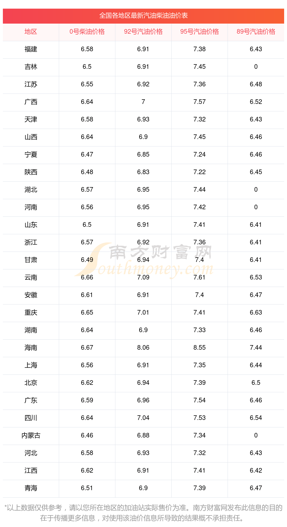 油价数据仅供参考,请以您所在地区的加油站报价为准。南方财富网发布此信息的目的在于传播更多信息,对使用该油价信息所导致的结果概不承担任何责任。