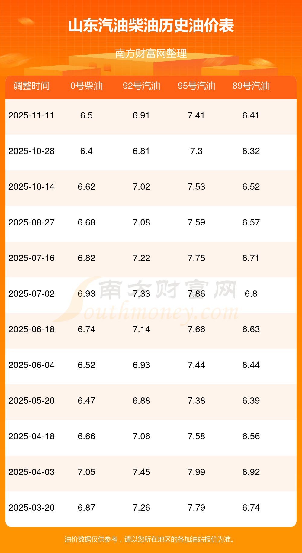 2025年山东汽油价格一览表